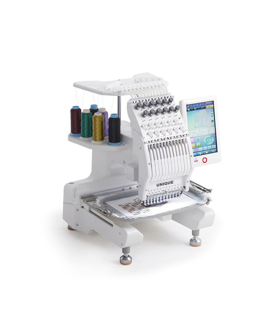 Automata elektronikus ipari területvarrógép. Érintőképernyős, programozható 100 programmal, fejbe épített energiatakarékos (direct drive) szervo motor, kétszálas huroköltés, központi olajozással, 90x60mm felületen tetszőleges varrat, beépített programozóval.